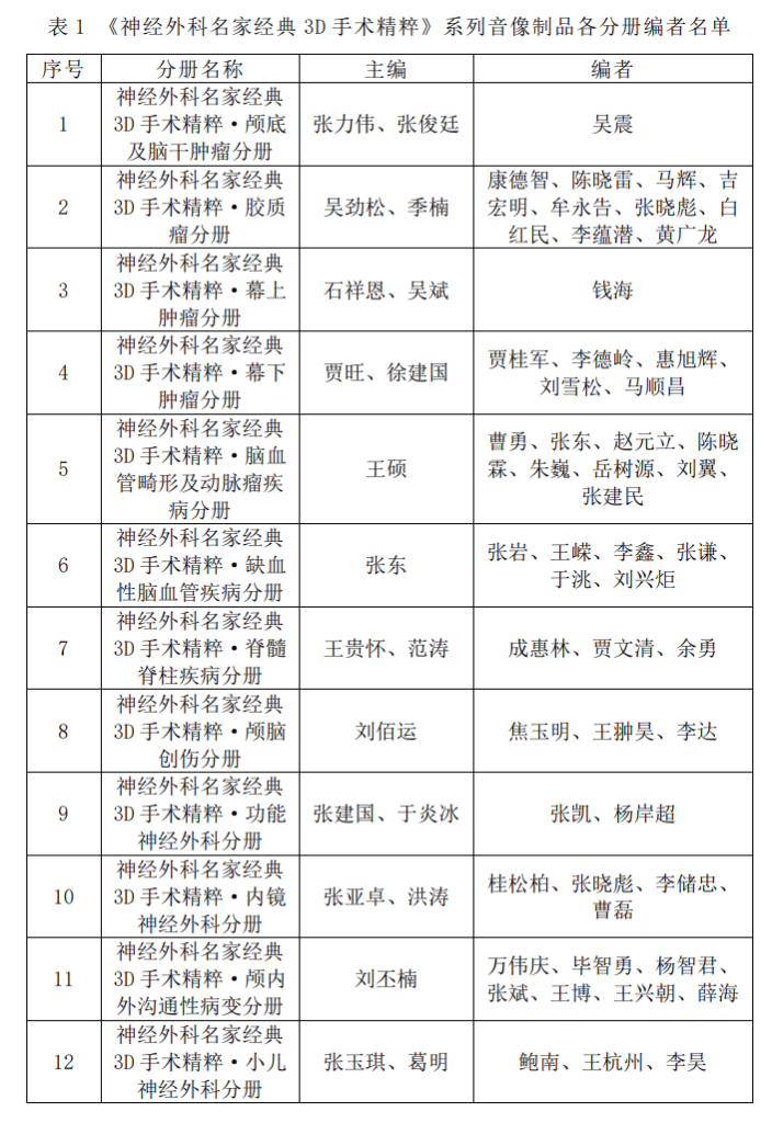 该作品汇聚了国内神经外科领域长期从事临床一线的行业专家70余位(见表1),在众多专家中有18人次荣获我国神经外科最高荣誉“王忠诚奖”。作为国内首套系统、规范、权威、先进的神经外科手术视频出版物,集中体现了新时代中国神经外科的发展水平。