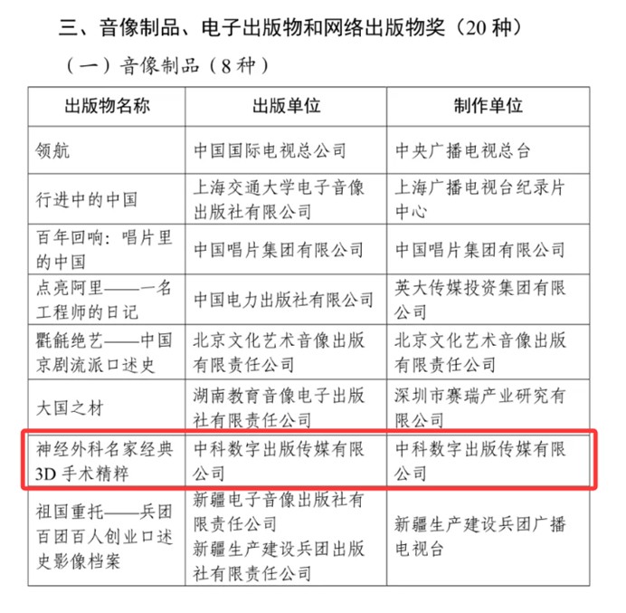 我国出版领域最高奖项——第六届中国出版政府奖评选结果近日正式揭晓,我司出版的由首都医科大学附属北京天坛医院张力伟教授担任总主编、70余位行业专家联合打造的《神经外科名家经典3D手术精粹》系列音像制品获得中国出版政府奖(音像制品奖)。